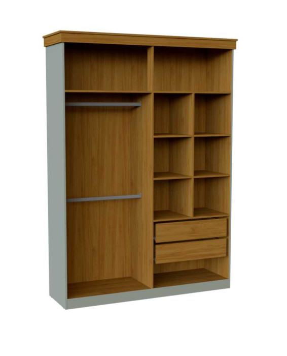 Construído em MDP de 15mm com pintura UV e acabamento Durata, o roupeiro é robusto, resistente e durável, garantindo anos de uso. O acabamento amadeirado interno proporciona um toque de sofisticação e aconchego ao ambiente.
